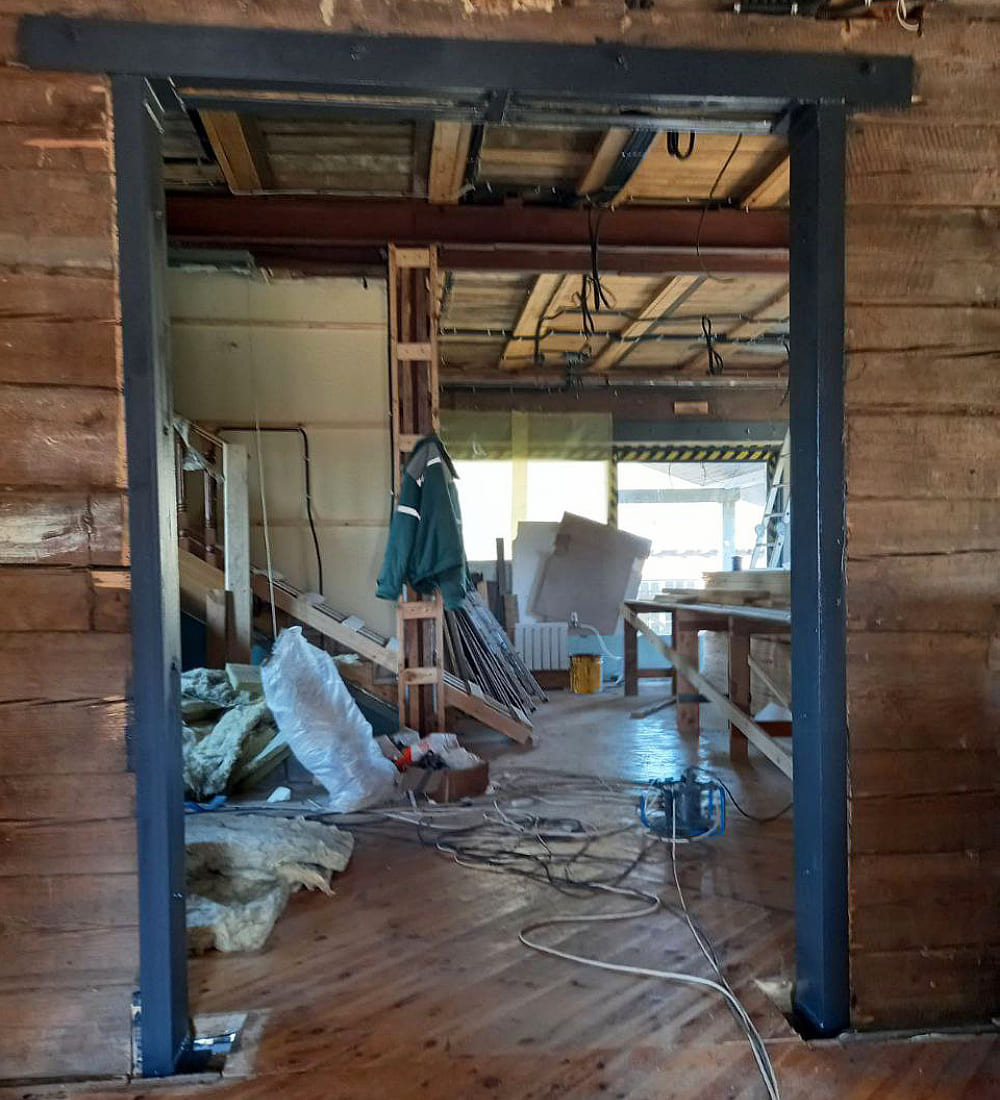Стойки швеллера обрамляют торцы деревянной стены из бруса, что не дает брусу разъезжаться и создает жесткость стены. Предварительно нашим конструктором делается расчет по усилению проема.